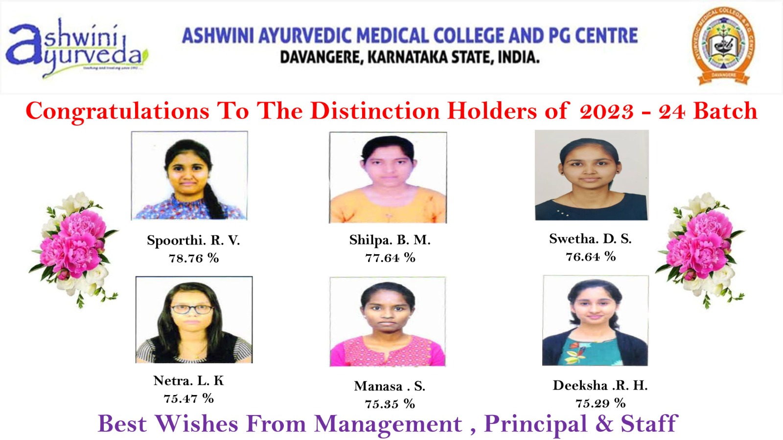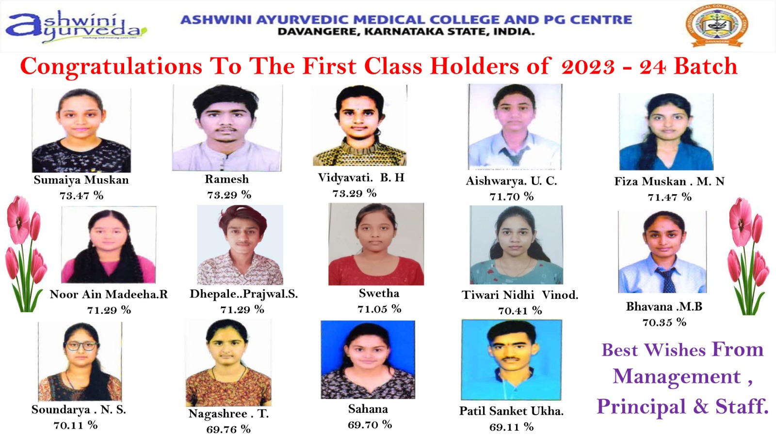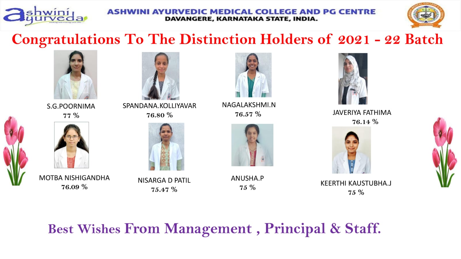 Dr. Rubina Begam achieved 6th rank in MS Shalya final RGUHS examination, under the Guidance of Dr. Mruthyunjay. N. Hiremath, H. O. D. Of Postgraduate Department studies in Shalya Tantra. AEA Ayurvedic Medical College and PG Centre, Davangere